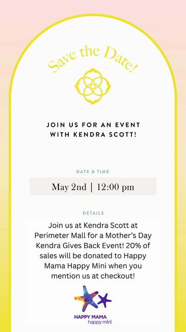 Shop in-store at Kendra Scott @ Avalon or online and mention Happy Mama Happy Mini — 20% of your purchase will support our mission to empower moms and minis!
